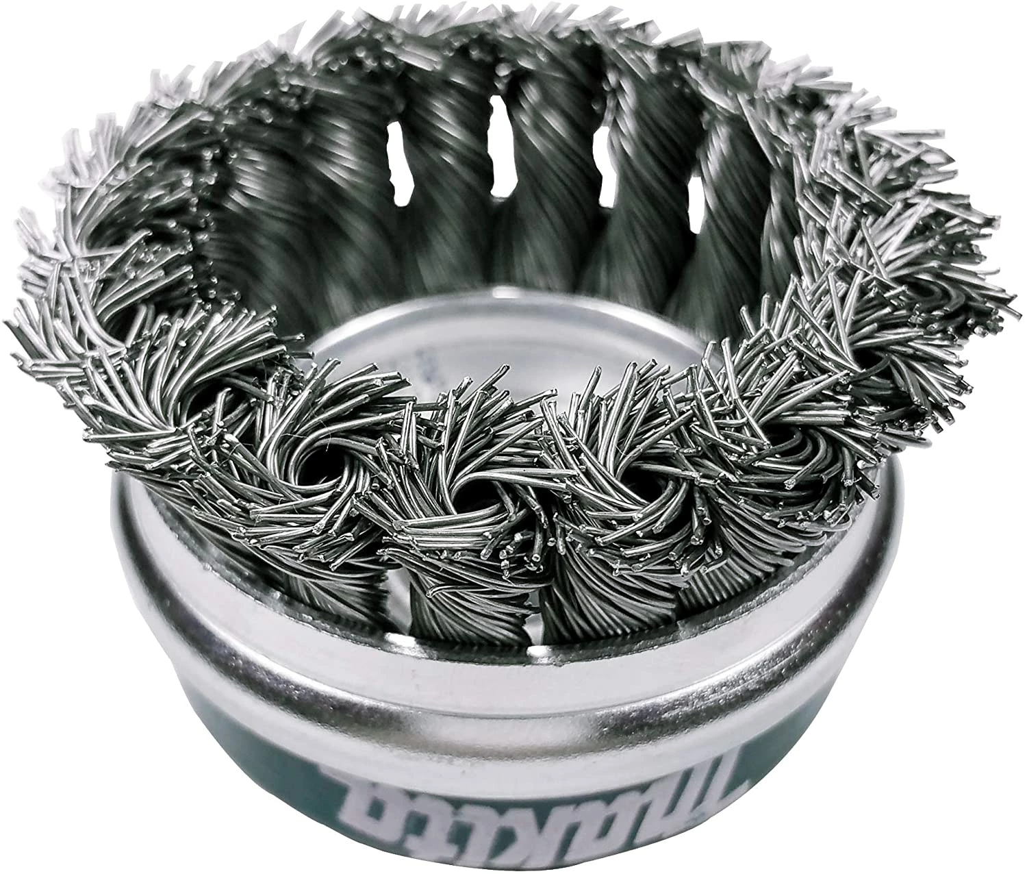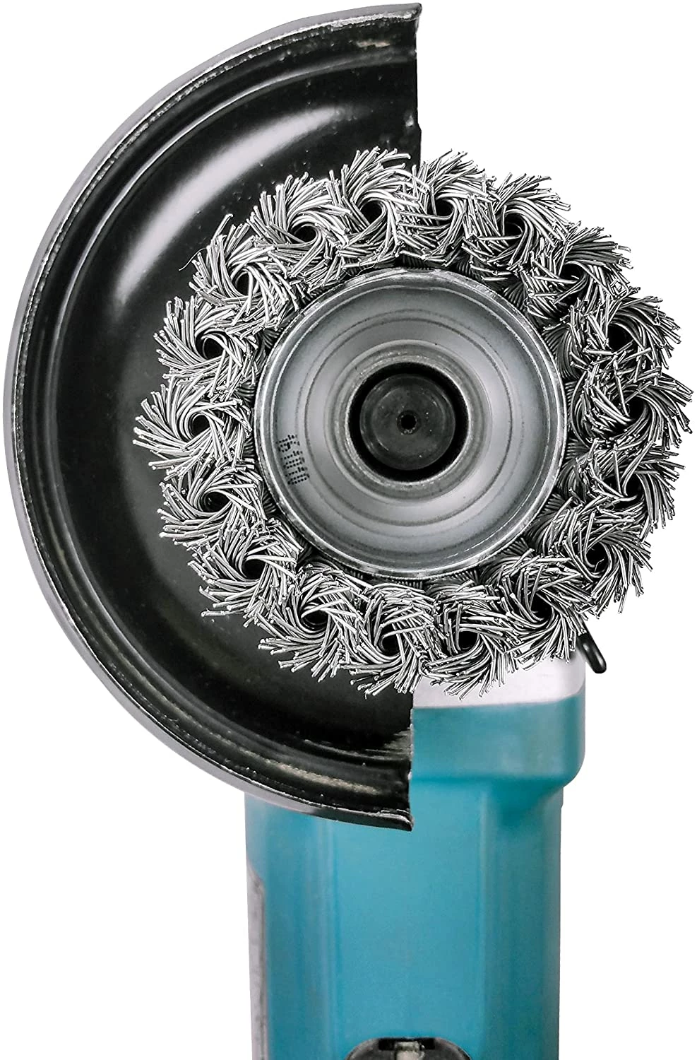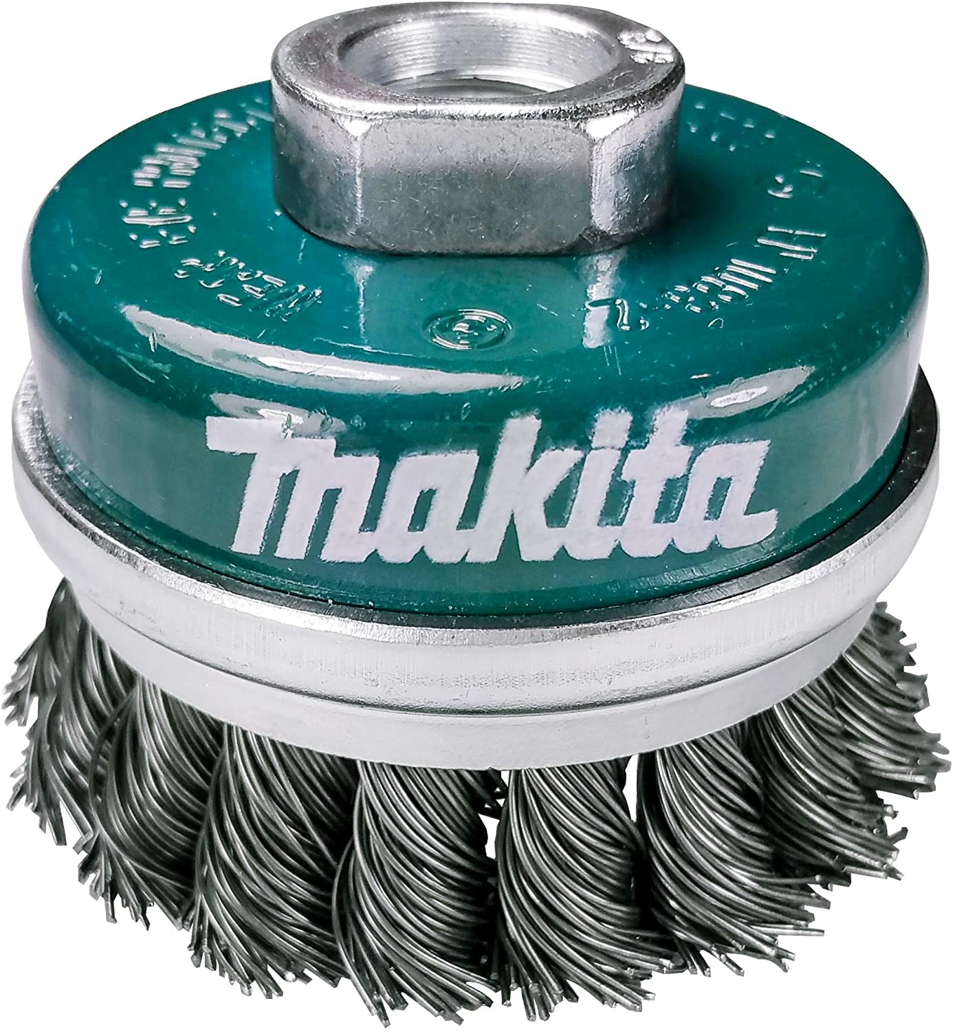 Simplify your metal conditioning work with this easy-to-use, long-lasting and quick cleaning 2.5†Makita Densely KNOTTED Wire Cup Brush, designed to work with your 4-1/2†Angle Grinder. Ideally suited for removing ultra-heavy corrosion, rust, paint, spatter and scale removal while also cleaning weld edges and deburring metal; great for cleaning castings, structural steel and sheet metal while also roughening for adhesion, finishing for appearance and preparation prior to plating or painting. Holding the brushes at an angle of no more than 5°, allowing only the TIPS to do the work with LIGHT, CONSTANT pressure ensures full wire-workpiece contact and maximal wire life. WARNING: Incorrect angles or excessive pressure makes the wires heat up, become fatigued and prematurely break, while also may show up as bluing of the wires and the “groaning” of the angle grinder from the excessive load. Unlike a coated abrasive, a wire brush or wheel is designed to condition metal surface area and is NOT a metal removal accessory. Carbon Steel Brushes should only work on Carbon Steel to avoid cross-contamination.