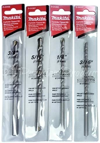 Makita’s 4 Piece ROUND SHANK Concrete Drill Bit Set is designed for up to 4″ Drilling into General concrete and brick material applications. Sleeve protected for safekeeping, the 4 piece drilling bit set has 4 of the most commonly used drilling, screwing or anchoring sizes of 3/16″, 1/4″, 5/16″ and 3/8″ for easy drilling. Concrete drilling bit set is optimized for Makita Hammer Drills while also fully compatible with all other Hammer Drills.