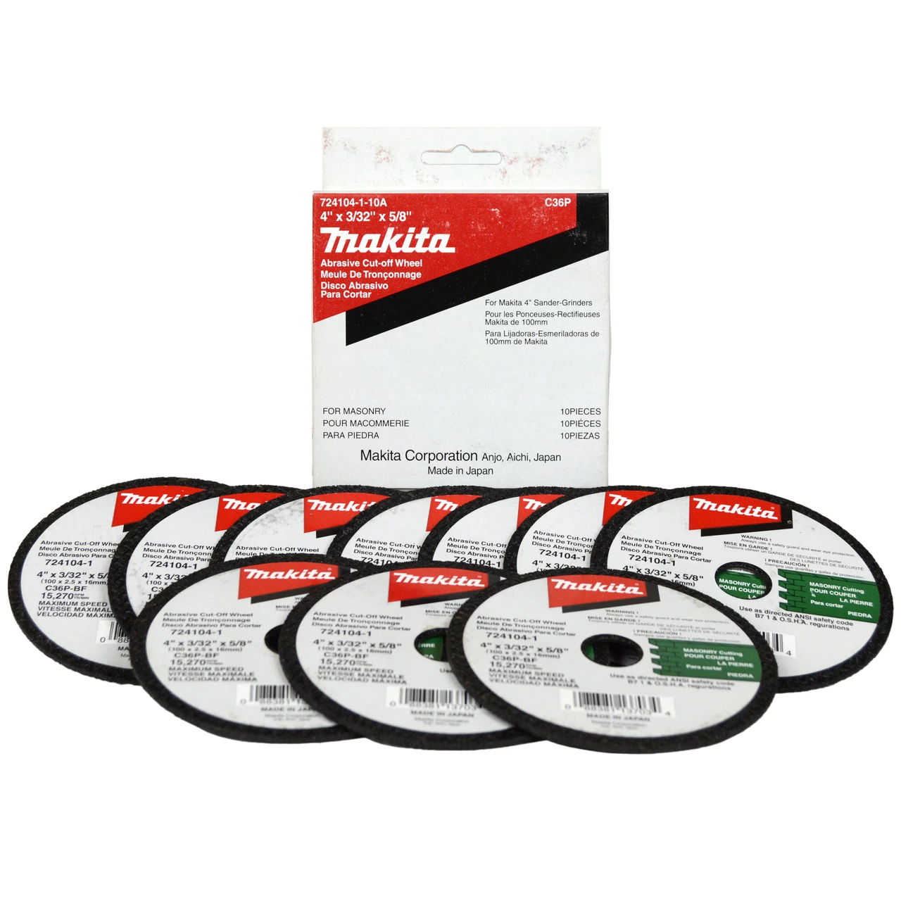 Brand:MakitaType:Cut-Off WheelsGrit:36Abrasive:Silicon CarbideOverall Diameter:4 in.Thickness:3/32 in.Arbor Diameter:5/8 in.Quantity:10 WheelsModel:724104-1-10A