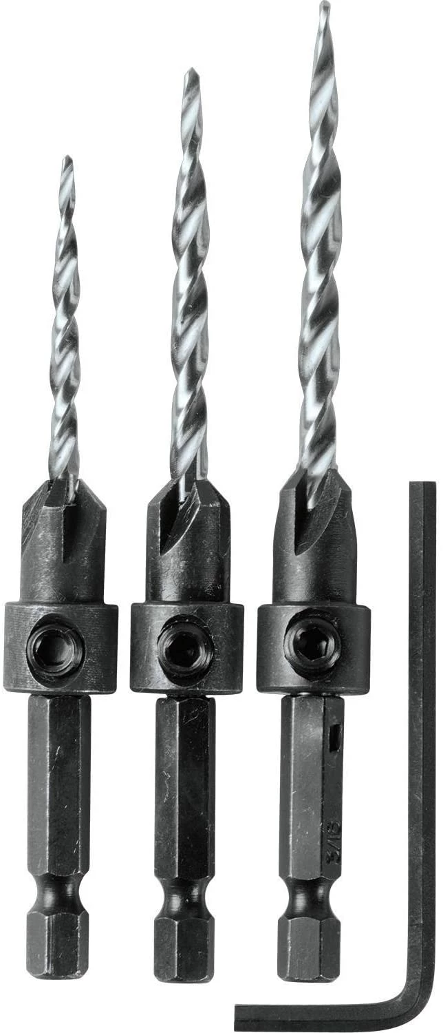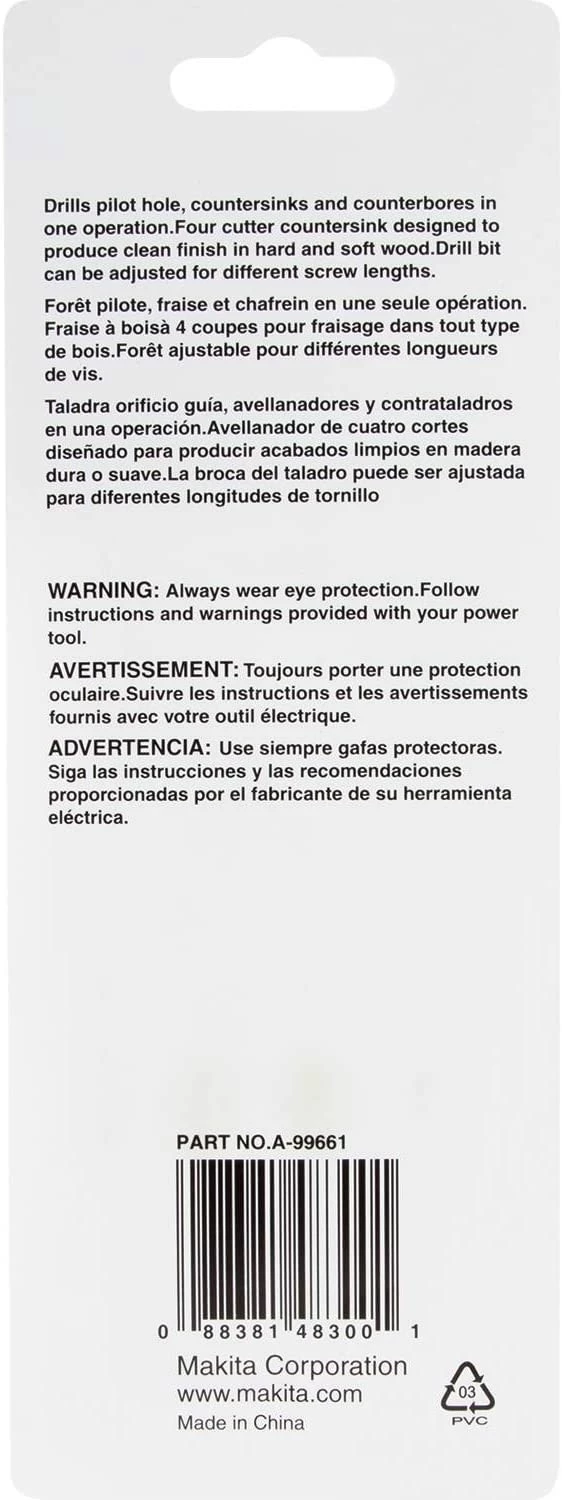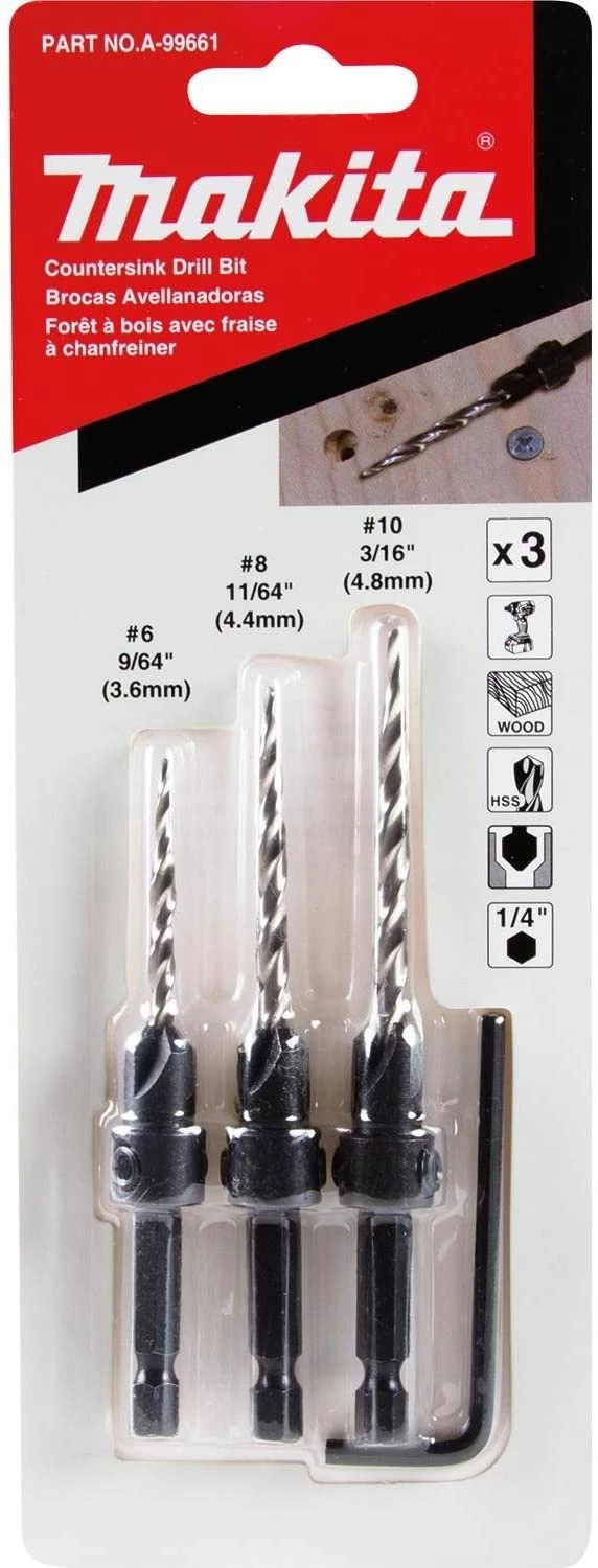 Makita has a deep line-up of drilling, driving and fastening tools and accessories. The Makita 3-piece Countersink with drill bit set with hex wrench (A-99661) is engineered for drilling pilot hole, countersinks and counterbores in one easy operation. The drill bit can be adjusted the desired drilling depth, and the 1/4â€â€™ hex shank fits in impact drivers and driver-drills. The 3-piece set includes #6, #8 and #10 countersinks plus a hex wrench.