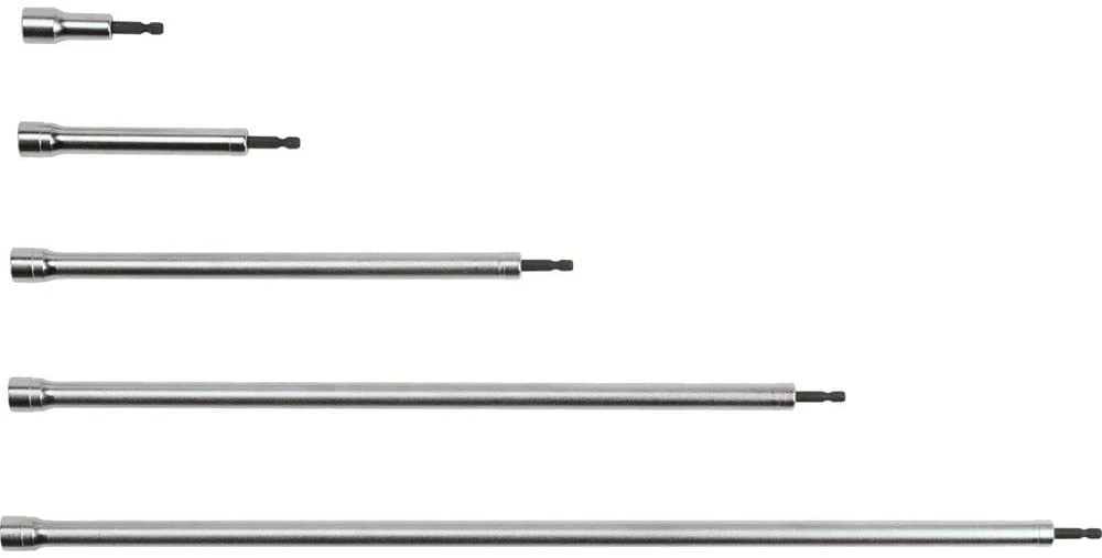 The Makita Hollow Sockets are designed to accelerate overhead fastening work by reducing time-spent hand threading fasteners over threaded rod. The hollow shafts allow long bolts and threaded rod to pass through in fastening applications while the increased socket lengths provide better access to nuts located in high places in ceiling or ductwork. The 1/4″ hex shank is press-fit for durability and drops readily into an impact driver or driver-drill for convenient, automated fastening.