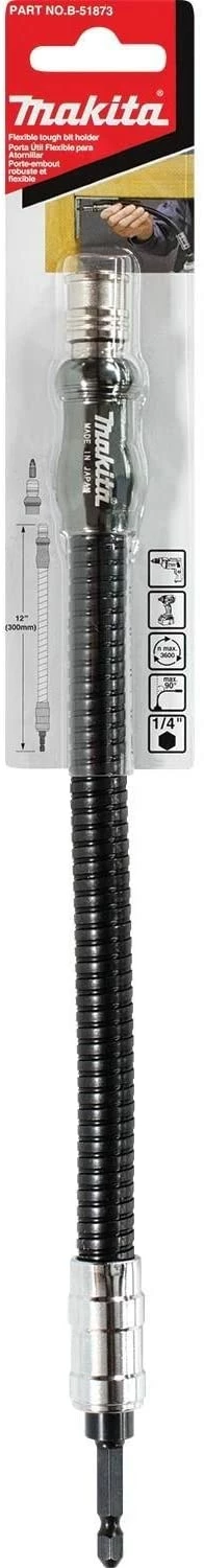 Get the right accessory for fastening in hard-to-reach spaces with the Makita 12 in. Flexible Bit Holder. The high quality steel construction is engineered for use with high-torque impact drivers, with a full 12″ length for extended reach.
