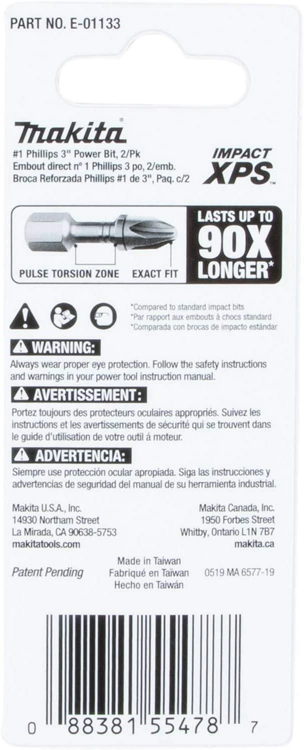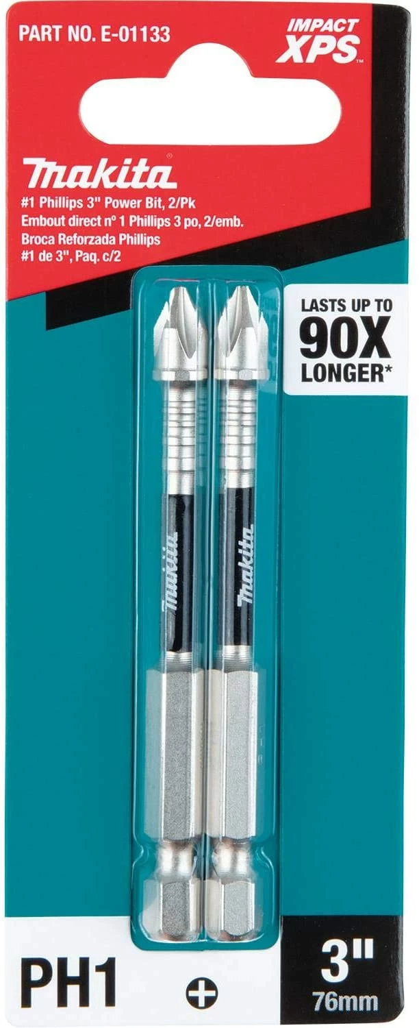 Makita Impact XPS is new innovation in fastening with insert bits and fastening accessories built for the demands of the professional contractor. The ImpactXPS #1 Phillips 3″ Power Bits are designed exclusively for use with high-torque impact drivers, and are engineered to last up to 90-times longer than standard insert bits. High-strength steel delivers longer bit life, and the precision-fit tip is engineered to prevent “cam-out” and stripping. The torsion section of the bit flexes under load to take pressure off of the bit tip for increased durability. The high quality steel construction is engineered for increased durability and features a matte nickel surface for best in class corrosion resistance. ImpactXPS #1 Phillips 3″ Power Bits are ideal for the most demanding jobs including deck building, framing, installing plywood subfloor, and more.