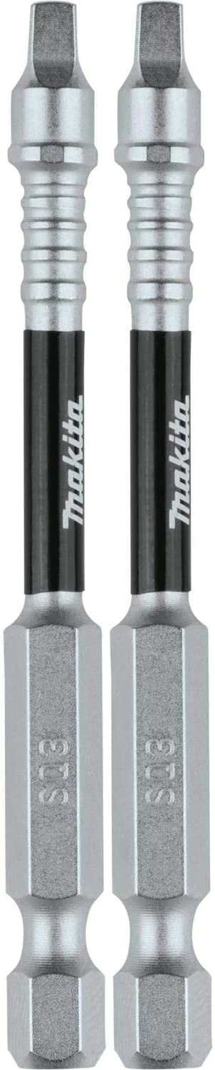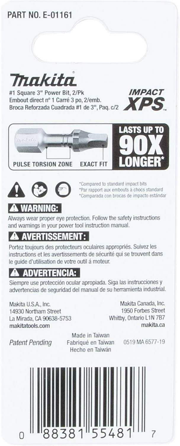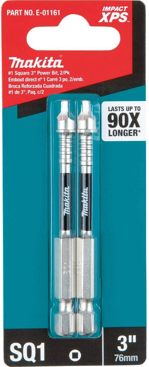 Makita Impact XPS is new innovation in fastening with insert bits and fastening accessories built for the demands of the professional contractor. The ImpactXPS #1 Square 3″ Power Bits are designed exclusively for use with high-torque impact drivers, and are engineered to last up to 90-times longer than standard insert bits. High-strength steel delivers longer bit life, and the precision-fit tip is engineered to prevent “cam-out” and stripping. The torsion section of the bit flexes under load to take pressure off of the bit tip for increased durability. The high quality steel construction is engineered for increased durability and features a matte nickel surface for best in class corrosion resistance. ImpactXPS #1 Square 3″ Power Bits are ideal for the most demanding jobs including deck building, framing, installing plywood subfloor, and more.