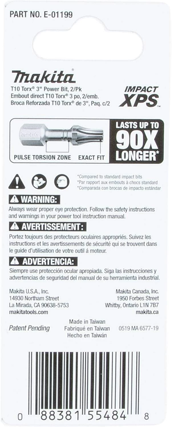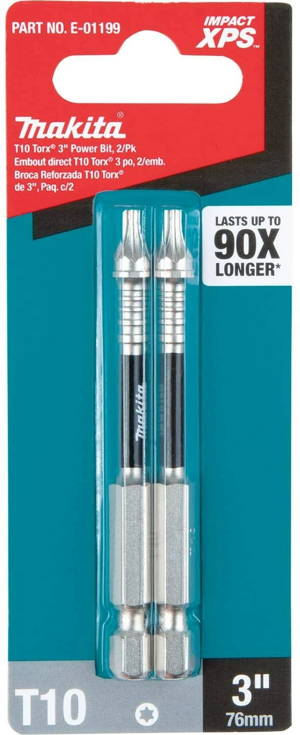 Makita Impact XPS is new innovation in fastening with insert bits and fastening accessories built for the demands of the professional contractor. The ImpactXPS T10 Torx 3″ Power Bits are designed exclusively for use with high-torque impact drivers, and are engineered to last up to 90-times longer than standard insert bits. High-strength steel delivers longer bit life, and the precision-fit tip is engineered to prevent “cam-out” and stripping. The torsion section of the bit flexes under load to take pressure off of the bit tip for increased durability. The high quality steel construction is engineered for increased durability and features a matte nickel surface for best in class corrosion resistance. ImpactXPS T10 Torx 3″ Power Bits are ideal for the most demanding jobs including deck building, framing, installing plywood subfloor, and more.