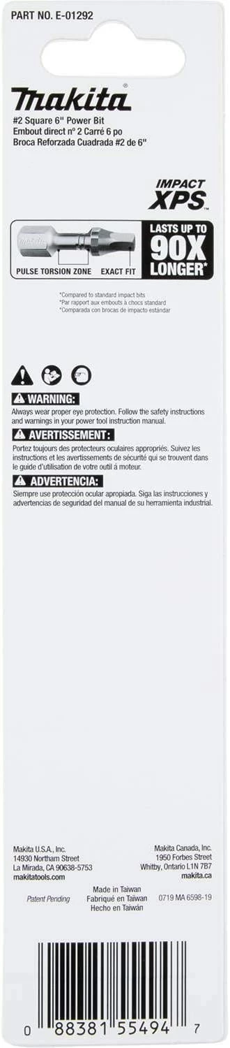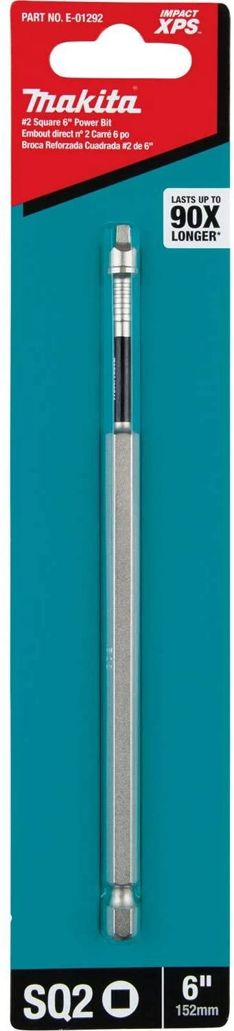 Makita Impact XPS is new innovation in fastening with insert bits and fastening accessories built for the demands of the professional contractor. The ImpactXPS #2 Square 6″ Power Bit is designed exclusively for use with high-torque impact drivers, and is engineered to last up to 90-times longer than a standard insert bit. High-strength steel delivers longer bit life, and the precision-fit tip is engineered to prevent “cam-out” and stripping. The torsion section of the bit flexes under load to take pressure off of the bit tip for increased durability. The high quality steel construction is engineered for increased durability and features a matte nickel surface for best in class corrosion resistance. ImpactXPS #2 Square 6″ Power Bits are ideal for the most demanding jobs including deck building, framing, installing plywood subfloor, and more.