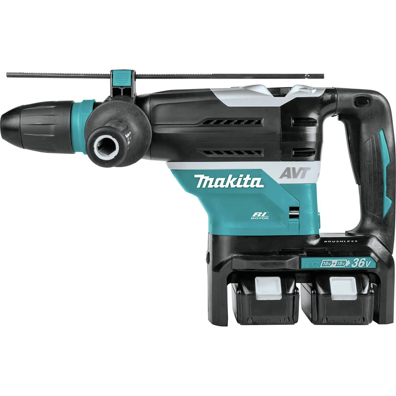 Makita XRH07PTU. Features: Two 18V LXT Lithium-Ion batteries deliver the power and run time for corded demands without leaving the 18V LXT platform. Powerful BL Brushless Motor delivers 250 to 500 RPM, 1,450-2,900 BPM and 8.4 ft. lbs. of impact energy to handle the most demanding applications. Dust extraction capability with optional Makita dust attachment kit. Torque limiting clutch engineered to prevent gear damage by automatically disengaging gears if the bit binds. Advanced anti-vibration technology (AVT) is a synchronized, three-component system that actively works to reduces vibration resulting in a low 5 m/s2. Advanced AVT includes an air actuated counterbalance that utilizes air pressure to produce counterweight motion and effectively reduce vibration. Advanced AVT includes a vibration absorbing housing which moves independently of the motor and hammer mechanism effectively isolating vibration. Advanced AVT includes an integrated damper spring at the base of the impact bolt engineered to absorb impact vibrations from the drill bit. Constant speed control automatically applies additional power to the motor to maintain speed under load to complete the most challenging jobs.