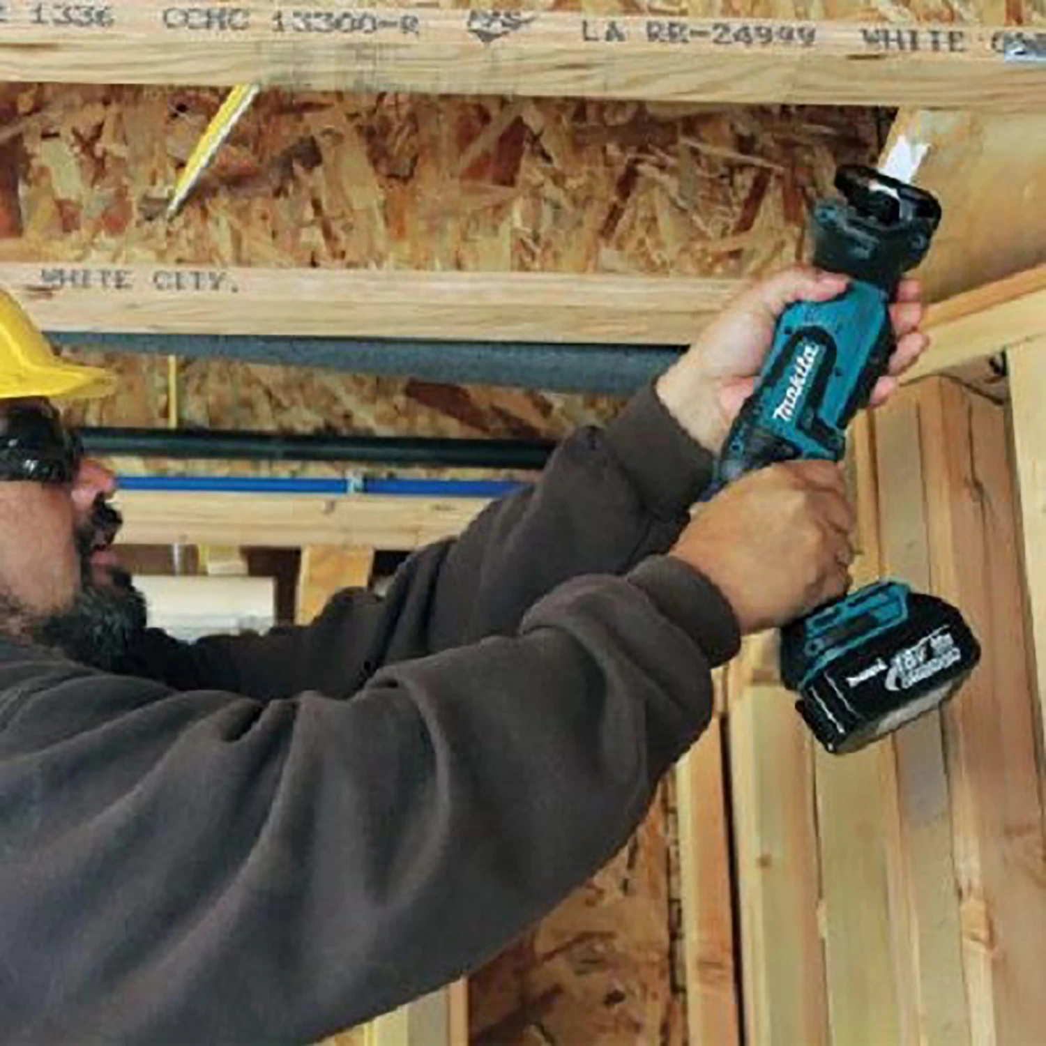 Makita XRJ01Z. Features: Variable speed (0 – 3,000 strokes per minute) combined with a 1/2 in. stroke length for faster and more efficient cutting.. Makita exclusive dual-position on/off switch allows for either paddle or trigger switch operation. Tool-less blade change system allows for faster blade installation and removal for increased productivity. Weighs only 3.9 lbs. with battery (sold separately) for reduced operator fatigue. Compact and ergonomic design at 15-5/8 in. long. Built-in LED light illuminates the work area. Rubberized soft grip provides increased comfort on the job. Ideal for a wide range of cutting applications. Equipped with Star Protection Computer Controls to protect against overloading, over-discharging and over-heating.