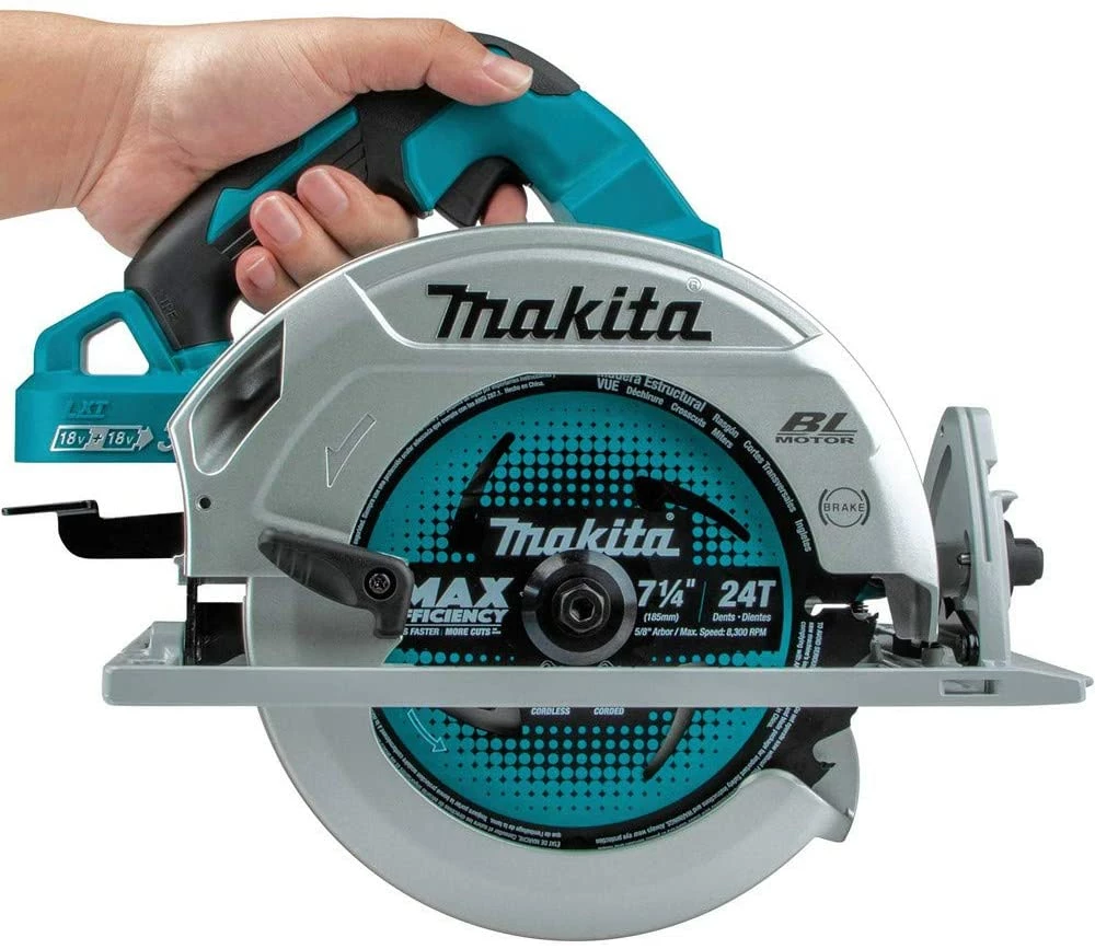 Makita, a pioneer in Brushless motor technology and battery innovation, combines both in the 18V X2 LXT (36V) Lithium-Ion Brushless 7-1/4†Circular saw (XSH06Z, tool only, batteries and charger sold separately). it’s powered by two 18V LXT Lithium-Ion batteries for maximum performance, and has an electronically-controlled BL Brushless motor that matches torque and RPM to the application. Makita 18V X2 means freedom from the cord, even for demanding applications like cutting sheet and dimensional lumber that traditionally called for a corded saw. Best of all, users can remain in one battery platform, using the same fast-charging 18V batteries with the XSH06Z as they use across the expansive Makita 18V LXT cordless tool system. The XSH06Z has a long list of features for efficient cutting without the cord. The electronically-controlled Brushless motor delivers a full 6, 000 RPM for efficient cutting, with automatic speed Change technology to adjust the cutting speed and torque under load for optimum performance. In internal testing, the XSH06Z made up to 600 cross-cuts per charge in 2×4 SPF lumber using two fully-charged 5.0Ah batteries. Added features include a large 2-11/16†cutting capacity at 90 degrees, and an Electric brake for maximum productivity. The saw has a die-cast magnesium base and blade guard with die-cast aluminum blade cover and motor housing, which combines durability with less weight (only 10.4 lbs. With batteries, sold separately). added features include a built-in dust blower to clean the line-of-cut, and a built-in tether notch (tether sold separately). it’s part of Makita’s expanding 18V Lithium-Ion system, the world’s largest cordless tool system powered by 18V Lithium-Ion slide-style batteries. Makita 18V Lithium-Ion batteries have the fastest charge times in their categories, so they spend more time working and less time sitting on the c